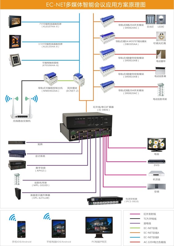 - 开关模块、调光模块,及安保消防接入模块等构成EC-NET总线A。